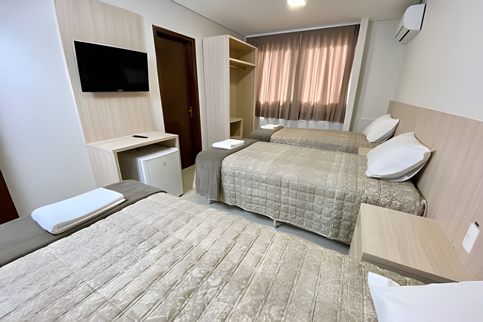 Quarto triplo confortável com TV e frigobar